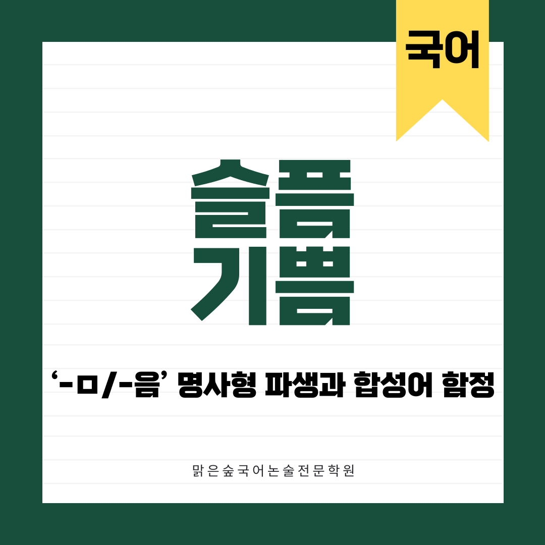 동사·형용사 어간에 ‘-ㅁ/-음’이 붙어 추상 명사를 만드는 파생이 자주 쓰입니다(슬프다→슬픔, 기쁘다→기쁨, 먹다→먹음). 문장 속에서 동작·상태를 개념화해 명사 자리로 옮길 수 있어 표현 폭이 넓어집니다.