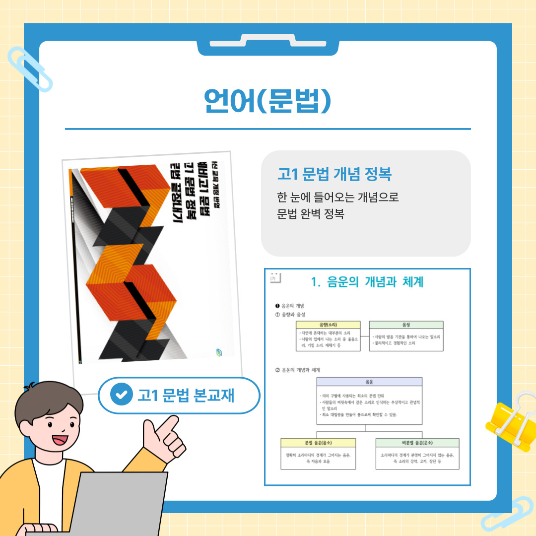 맑은숲국어에서는 ‘고1 문법 본교재’로 기본 개념을 정리한 뒤, ‘문법 워크북’을 통해 반복 복습과 적용 문제를 풀며 개념을 완전히 자기 것으로 만듭니다.
